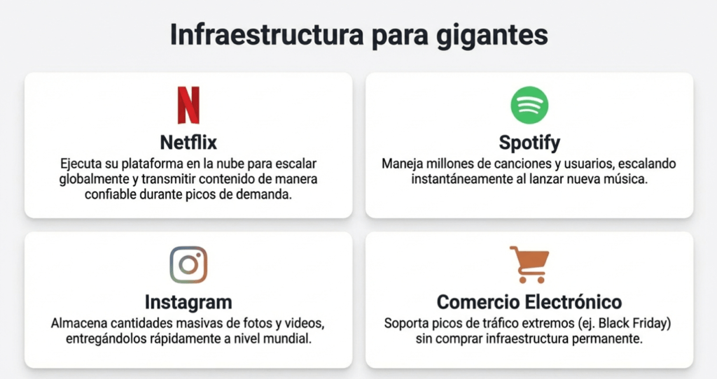 | EC2 (Elastic Compute Cloud) | Servicio de Infraestructura (IaaS) | Servidores o computadoras virtuales en la nube de Amazon (AWS) que se pueden crear y redimensionar. | Netflix (ejecución de plataforma), Instagram (almacenamiento y entrega de contenido multimedia). | Escalabilidad global, alta disponibilidad y modelo de pago por uso (solo por lo que se utiliza). | Alto: El usuario selecciona el tipo de instancia y gestiona todo el software que se ejecuta en ella. |