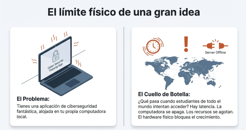 Imagina que tienes una idea fantástica para una aplicación que ayuda a los estudiantes a practicar la ciberseguridad y la alojas en tu propia computadora en tu país. Pero, ¿qué puedes hacer cuando usuarios de otras partes del mundo intentan acceder a ella y experimentan retrasos? ¿Qué pasa si muchos estudiantes se conectan al mismo tiempo o si tu computadora está apagada? Estos límites dificultan el crecimiento de la aplicación.