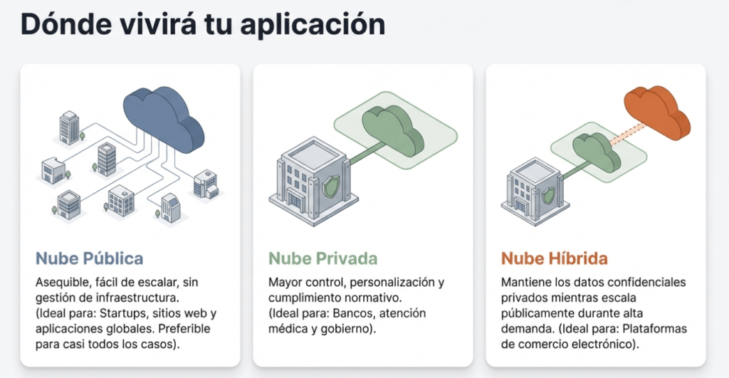 | Nube Privada | Tipo de Despliegue | Infraestructura de nube construida y utilizada exclusivamente para una sola organización. | Bancos, organizaciones de salud y agencias gubernamentales. | Mayor control, personalización y cumplimiento normativo para el manejo de datos sensibles. | Alto: La organización suele gestionar o supervisar la infraestructura dedicada. |