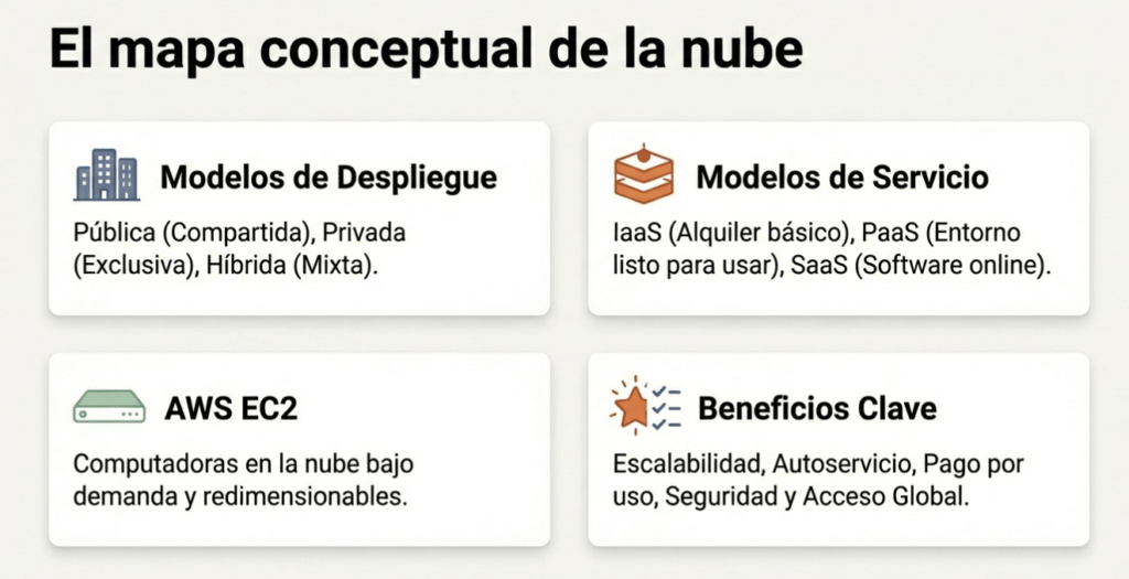 | Computación en la Nube (General) | Fundamento | Uso de recursos informáticos (servidores, almacenamiento) a través de internet en lugar de hardware local. | Spotify (manejo de millones de canciones), Tiendas online (picos de tráfico en Black Friday). | Auto-servicio bajo demanda, acceso global y reducción de costos iniciales. | Variable: Depende del modelo de servicio (IaaS, PaaS, SaaS) elegido. |