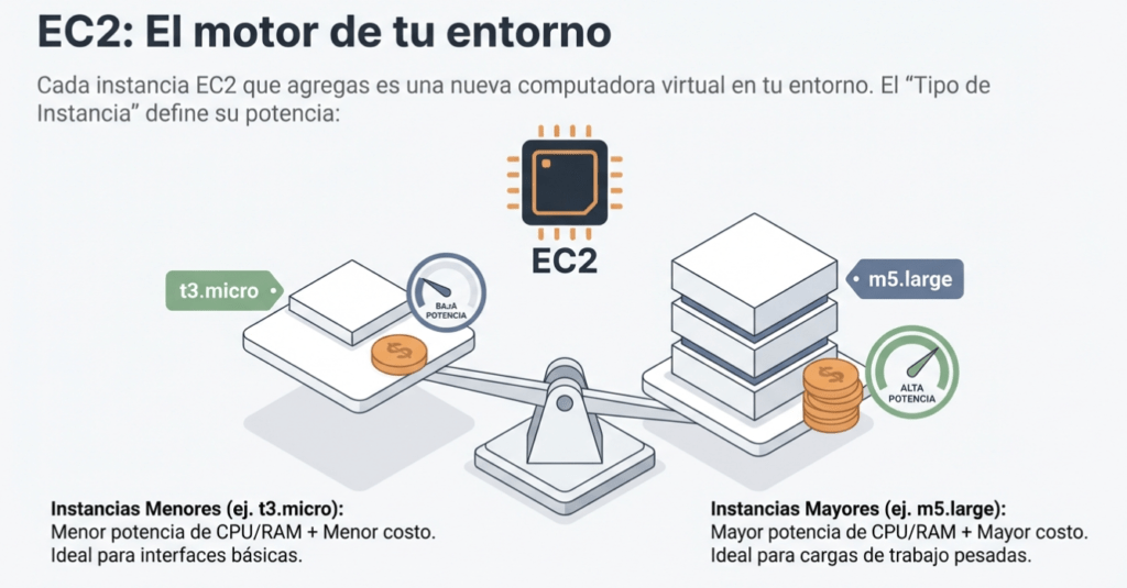 - Tipo de instancia (por ejemplo: t2, t3, m5): Los tipos de instancia describen la potencia del equipo virtual. Algunos tienen más CPU y RAM y, por lo tanto, son más costosos. Usted elige el tipo de instancia según sus necesidades, teniendo en cuenta que:
