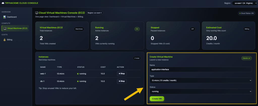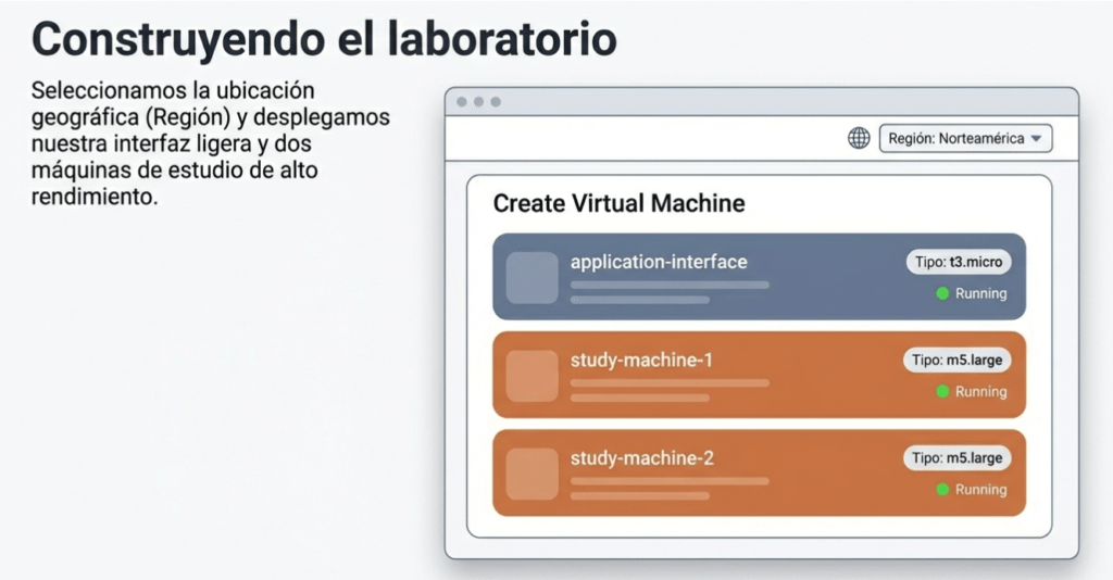 Creará tres computadoras virtuales (instancias EC2) para alojar su aplicación de capacitación en ciberseguridad. Esto se alinea con el modelo de Infraestructura como Servicio (IaaS) que aprendió anteriormente, ya que las prácticas de ciberseguridad a menudo requieren acceso completo al sistema operativo. Esto le permite instalar herramientas, configurar el sistema y simular ataques y defensas de forma segura, como en entornos reales