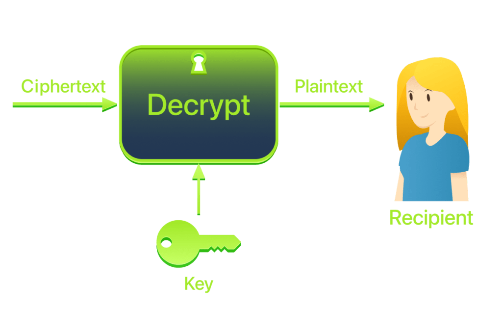 Proceso de descifrado: texto cifrado + algoritmo de descifrado + clave → texto plano