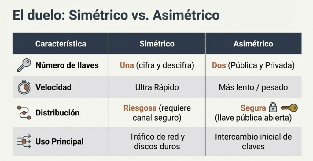Uso principalCifrado de datos masivos (archivos, tráfico de red)Compartir claves de forma segura y con certificados digitales