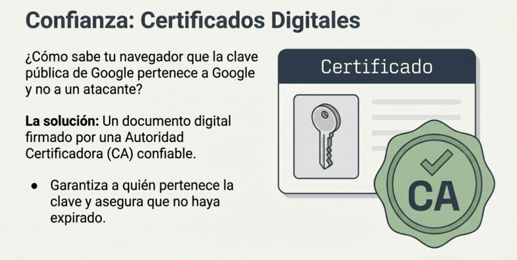Quizás te preguntes: ¿cómo sabe Alice que la clave pública pertenece realmente a Bob y no a un atacante que se hace pasar por él? Ahí es donde entran en juego los certificados .