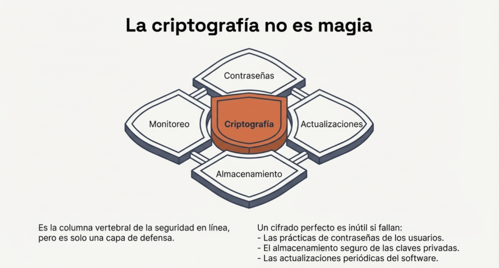 La criptografía es una de las herramientas más cruciales en el arsenal de un defensor. Protege la confidencialidad y la integridad, y es la columna vertebral de casi todos los sistemas de seguridad que se utilizan en línea. Pero no es magia. Es una capa de un panorama de seguridad mucho más amplio que incluye: