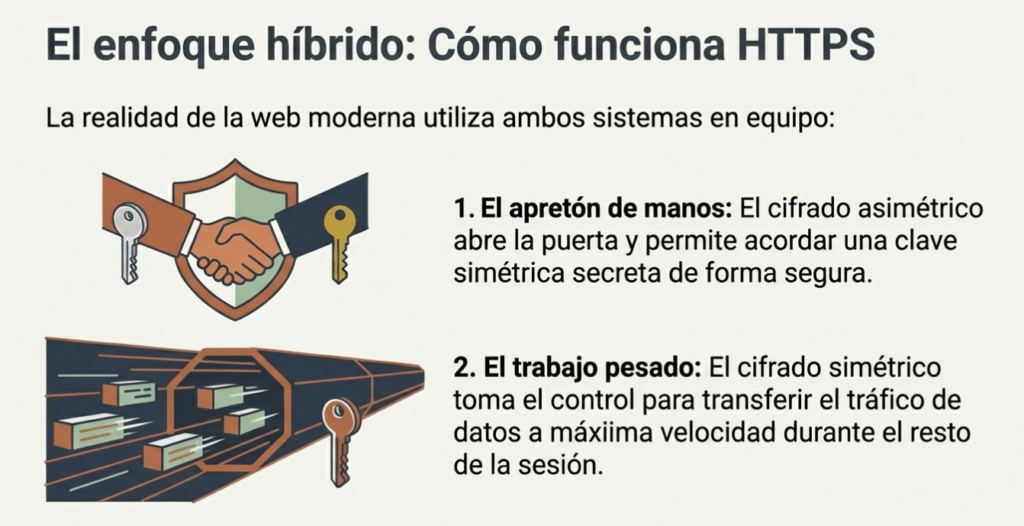 • El cifrado simétrico se hace cargo del resto de la sesión para gestionar los datos de manera eficiente.