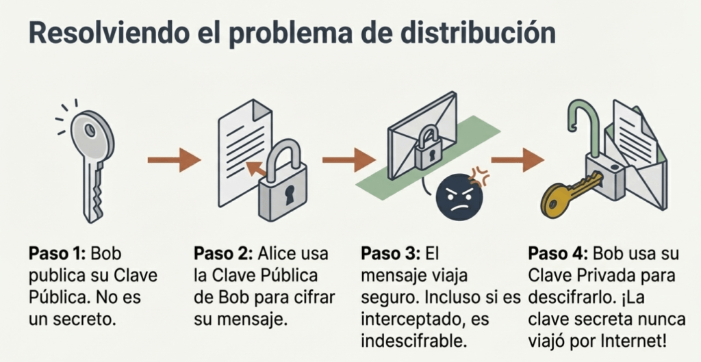 Incluso si un atacante intercepta el mensaje cifrado, no podrá descifrarlo sin la clave privada de Bob.
