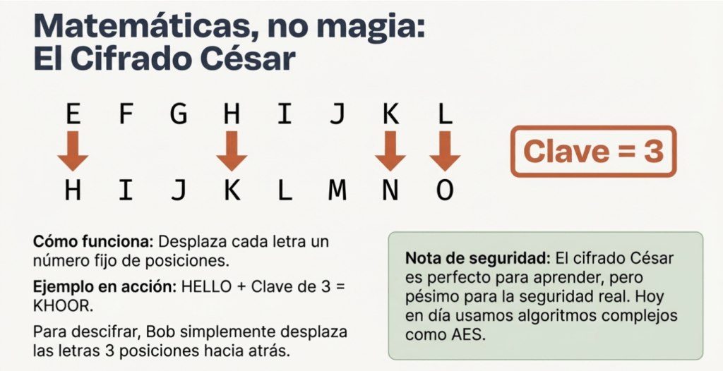 El cifrado César desplaza cada letra de tu mensaje un número fijo de posiciones en el alfabeto. Ese número fijo es tu clave .