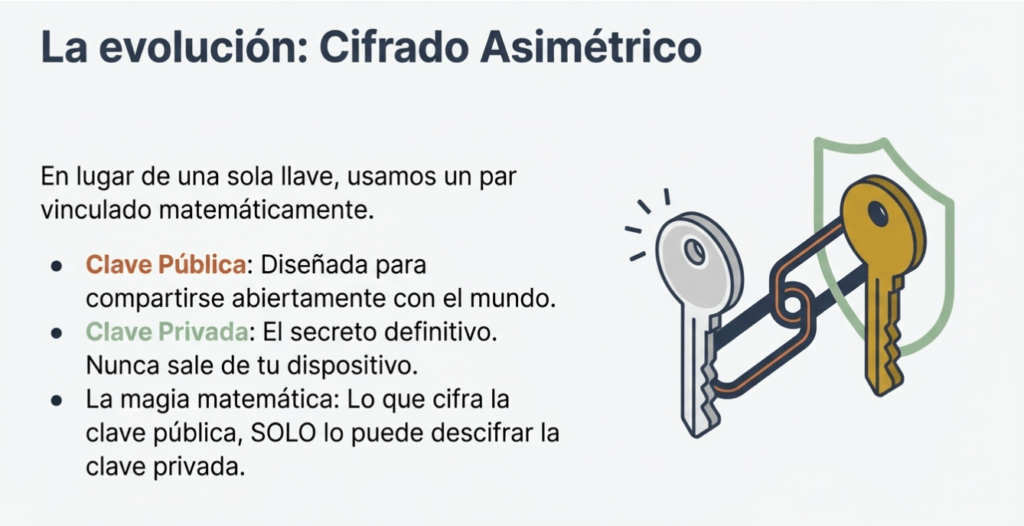 Para resolver ese problema surgió el cifrado asimétrico, un sistema que utiliza dos claves diferentes pero relacionadas matemáticamente. Una de ellas es pública y puede compartirse libremente, mientras que la otra es privada y solo la conoce su propietario. Cualquier persona puede utilizar la clave pública para cifrar un mensaje, pero únicamente quien posee la clave privada podrá descifrarlo. Este modelo introduce una forma mucho más segura de establecer comunicaciones entre sistemas que no se conocen previamente.