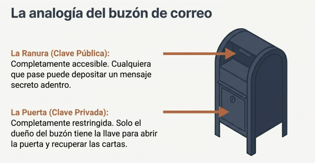 • La ranura de correo en la parte superior es la llave pública . Cualquiera que pase por allí puede dejar una carta. Es completamente abierta y accesible.