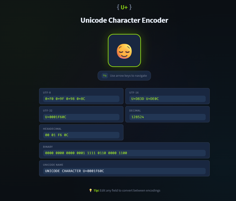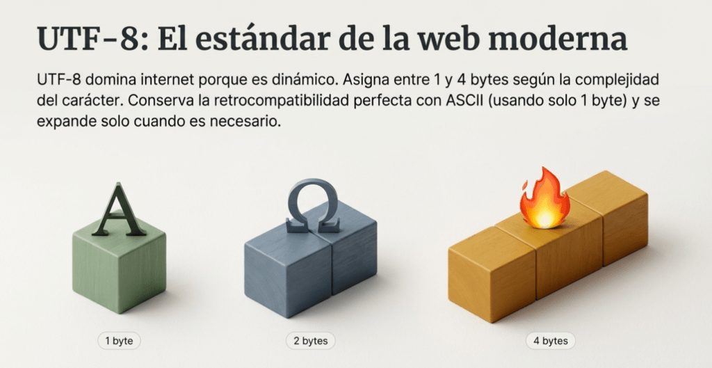 Dado que encontrará UTF-8, UTF-16 y UTF-32, los abordaremos brevemente sin profundizar demasiado. Lo que necesita saber es que UTF-8 es muy común en la web moderna. Codifica los puntos Unicode en 1 a 4 bytes dinámicamente. En otras palabras, decide la cantidad de bytes según la complejidad del carácter. Los caracteres ASCII ( U+0000a U+007F) usan exactamente 1 byte, idéntico al ASCII original, lo que garantiza una compatibilidad con versiones anteriores perfecta. Los caracteres no ASCII como Ω ( U+03A9) usan 2 bytes, mientras que las escrituras complejas o emojis como 🔥 ( U+1F525) requieren 4 bytes. Esta flexibilidad nos permite cubrir el estándar Unicode sin desperdiciar bytes.