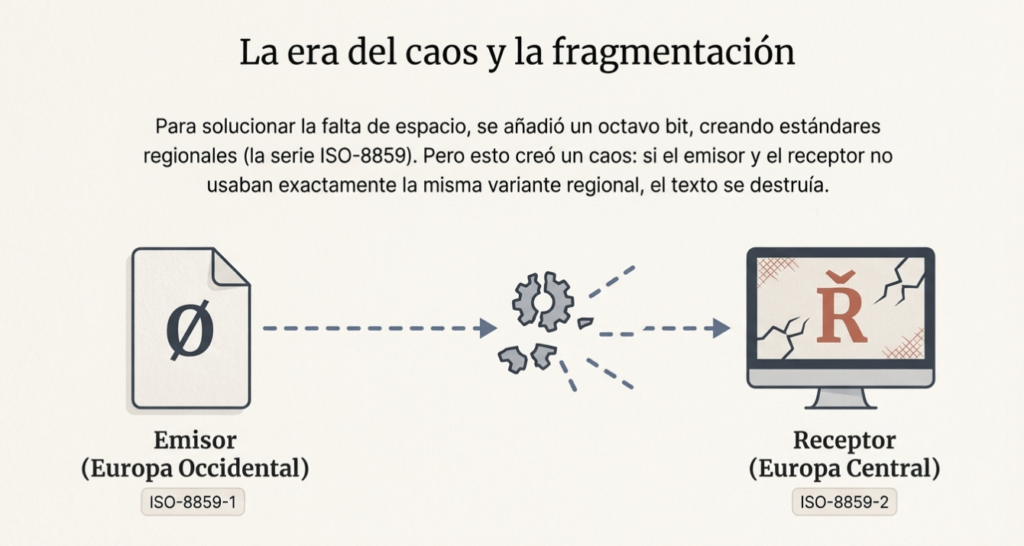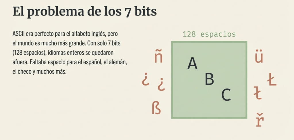 Durante los primeros años de la informática surgió ASCII, un estándar creado en 1963 que utilizaba 7 bits para representar caracteres. Esto permitía codificar únicamente 128 símbolos, suficientes para el alfabeto inglés, números y algunos signos de puntuación básicos. Sin embargo, este sistema pronto mostró sus limitaciones. No tenía espacio para letras con acentos, caracteres de otros alfabetos ni símbolos utilizados en distintos idiomas del mundo. Cuando diferentes sistemas intentaban interpretar archivos usando codificaciones incompatibles aparecía el conocido problema del “gibberish”, donde el texto se convertía en una serie de caracteres extraños e incomprensibles.