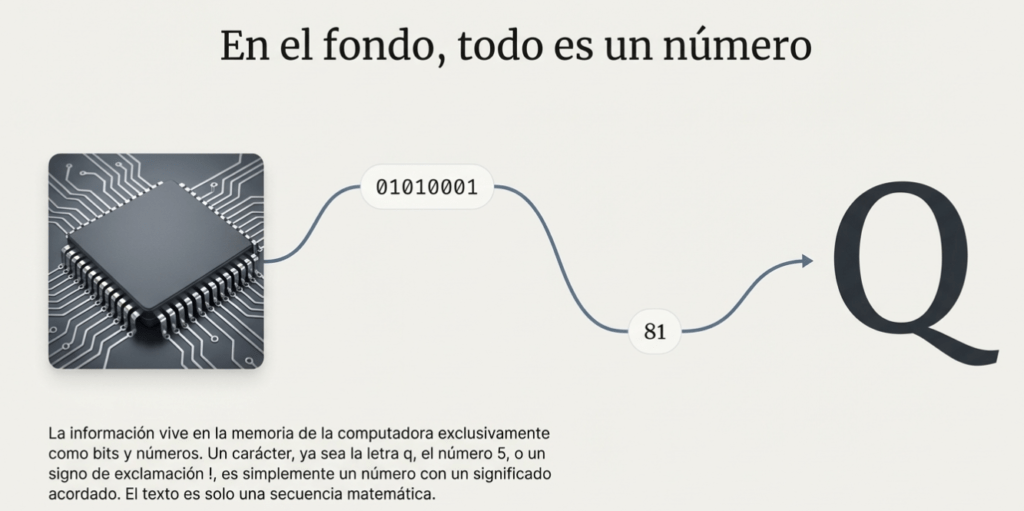 La representación es la idea de que los datos residen en la memoria como bits y números. A su vez, la codificación es la correspondencia específica y acordada entre números y significados, como qué número corresponde al carácter «A». En un texto, a cada carácter, como q, 5o !, se le asigna un código numérico, de modo que una cadena se convierte en una secuencia de números que la computadora almacena y procesa como cualquier otro dato.
