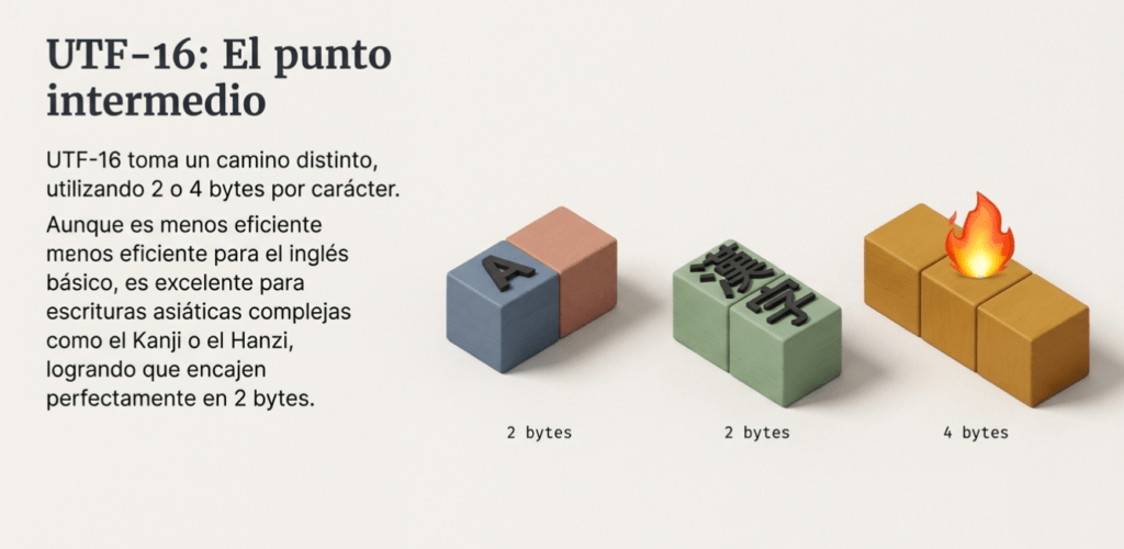 UTF-16 toma una ruta diferente; utiliza 2 o 4 bytes por carácter. Los caracteres comunes, como la mayoría de los latinos, cirílicos o chinos hanzi, caben en 2 bytes; sin embargo, los menos comunes, como los emojis o las escrituras antiguas, requieren un par, es decir, dos unidades de 16 bits que suman 4 bytes. Por ejemplo, la letra Ase codifica como U+0041, mientras que el emoji 🔥 necesita dos y se codifica como U+D83D U+DD25.