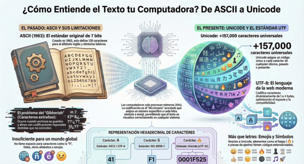 Las computadoras no entienden letras, palabras ni idiomas de la forma en que lo hacen las personas. Para una máquina, todo se reduce a números representados en bits. Cada carácter que aparece en una pantalla —ya sea una letra, un número, un símbolo o incluso un emoji— está asociado a un código numérico específico. Este sistema de correspondencias funciona como un diccionario digital que permite convertir texto humano en datos que el hardware puede procesar.