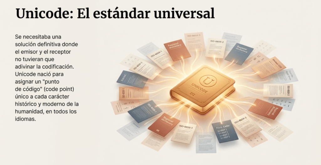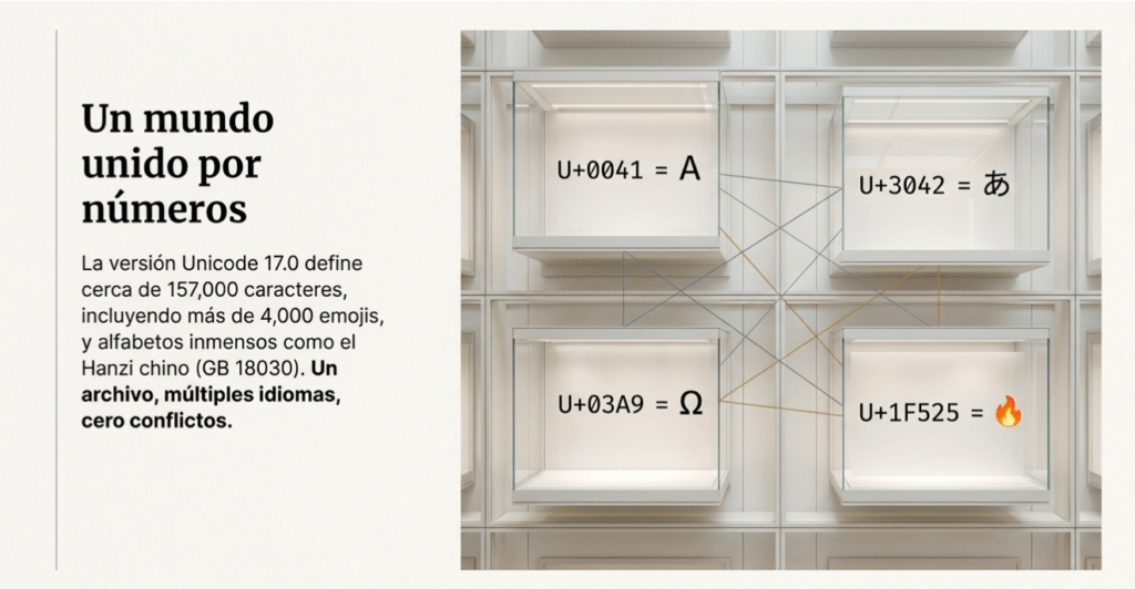 A medida que la informática se volvió global, surgió la necesidad de un sistema mucho más amplio y universal. Así nació Unicode, un estándar diseñado para asignar un código único a prácticamente cualquier carácter utilizado por la humanidad. Actualmente incluye más de 157,000 caracteres que abarcan alfabetos modernos, escrituras históricas, símbolos matemáticos, musicales y hasta emojis.