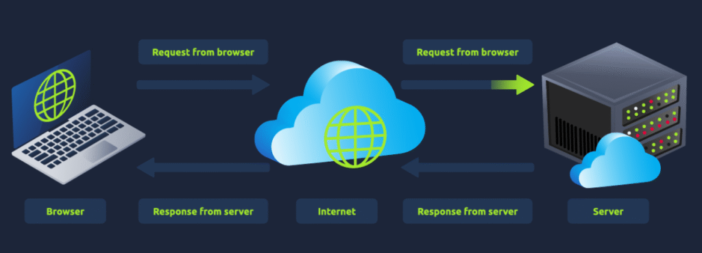 Cuando visitas un sitio web, tu navegador ( como Safari o Google Chrome ) realiza una solicitud a un servidor web solicitando información sobre la página que estás visitando. Este responderá con datos que tu navegador utiliza para mostrarte la página; un servidor web es simplemente una computadora dedicada, ubicado en otra parte del mundo, que gestiona tus solicitudes.