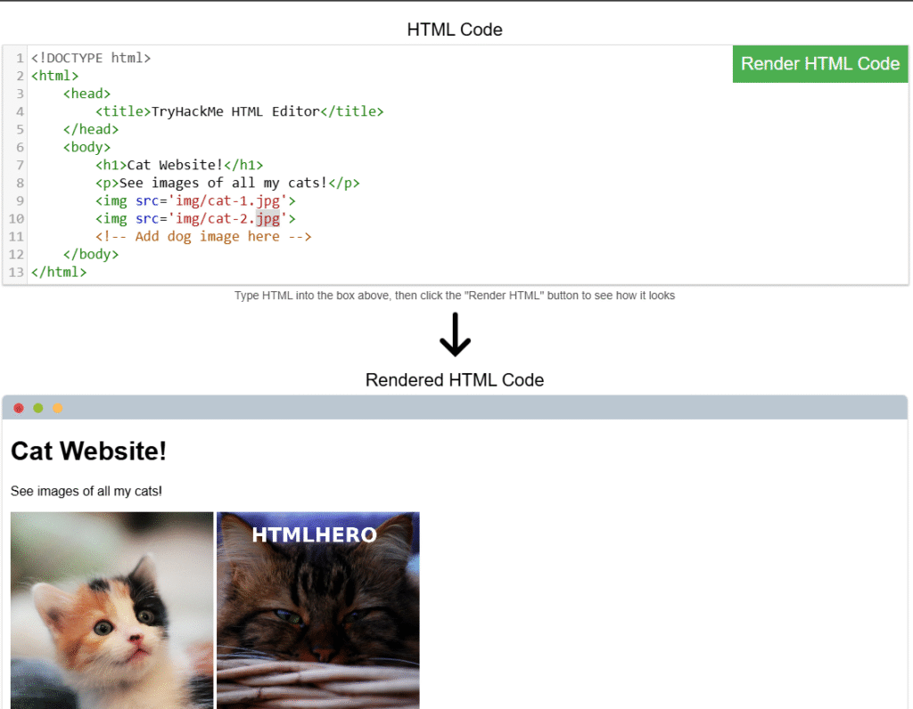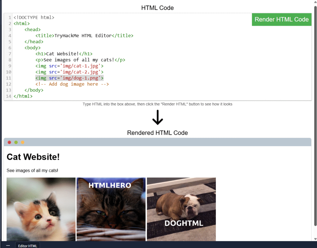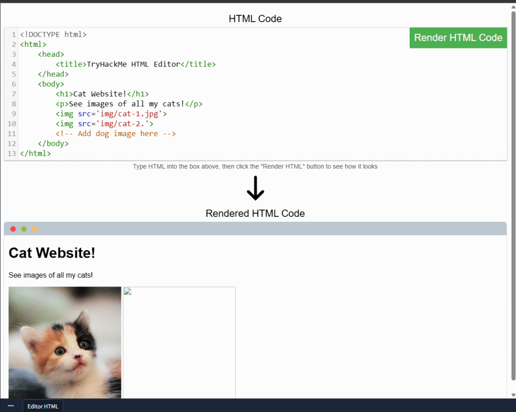 ¡Juguemos con HTML! Primero, haz clic en el botón «Ver sitio» dentro de esta tarea. A la derecha, verás un cuadro que muestra el HTML. Si introduces HTML en el cuadro y haces clic en el botón verde «Mostrar código HTML», se mostrará el HTML en la página; deberías ver una imagen de gatos.