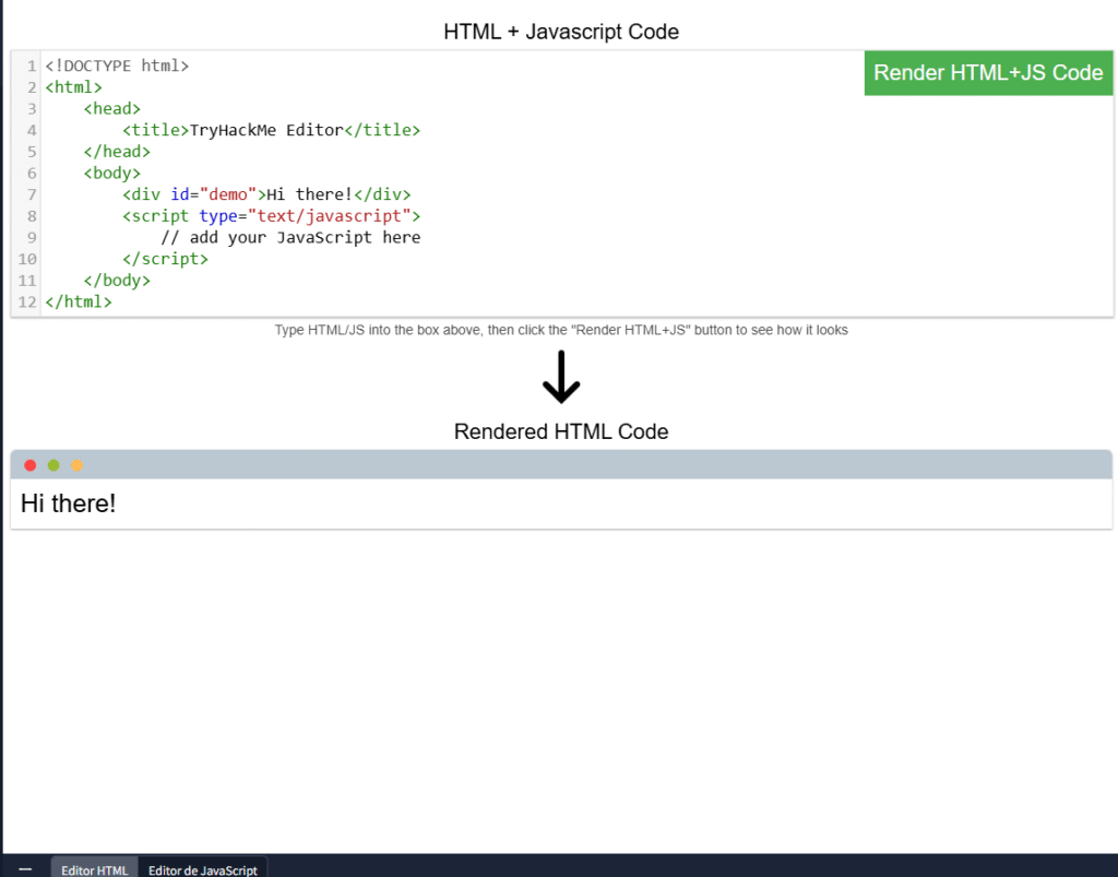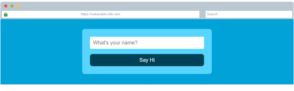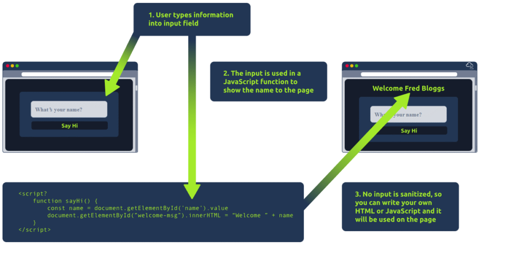 Cuando un usuario tiene control de cómo se muestra su entrada, puede enviar código HTML (o JavaScript) y el navegador lo usará en la página, lo que le permitirá controlar la apariencia y la funcionalidad de la página. La imagen de arriba muestra cómo un formulario envía texto a la página. Lo que el usuario introduce en el campo «¿Cuál es tu nombre?» se pasa a una función JavaScript y se muestra en la página. Esto significa que si el usuario añade su propio HTML o JavaScript en el campo, este se utiliza en la función sayHi y se añade a la página. Esto significa que puedes añadir tu propio HTML (como una etiqueta <h1>) y se mostrará como HTML puro.