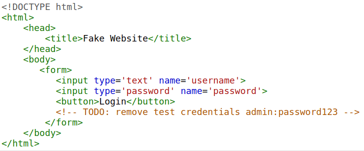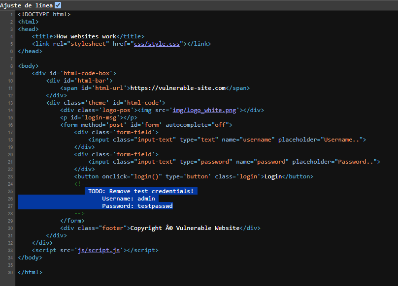 La información confidencial puede utilizarse para facilitar el acceso de un atacante a diferentes partes de una aplicación web. Por ejemplo, podría haber comentarios HTML con credenciales de inicio de sesión temporales, y si al consultar el código fuente de la página se encuentra esto, podría usar estas credenciales para iniciar sesión en otra parte de la aplicación (o peor aún, para acceder a otros componentes del backend del sitio). Siempre que evalúe una aplicación web en busca de problemas de seguridad, una de las primeras cosas que debe hacer es revisar el código fuente de la página para ver si puede encontrar credenciales de inicio de sesión expuestas o enlaces ocultos.