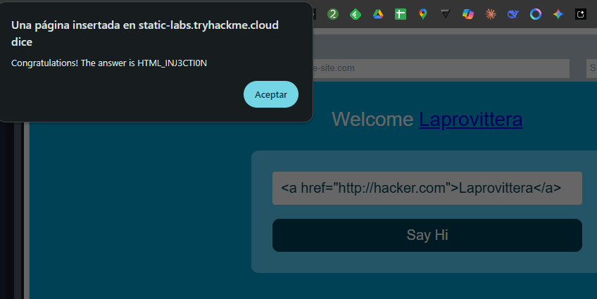 - Inyección HTML / XSS (cliente): cuando la entrada del usuario se inserta en la página sin sanitizar, se puede inyectar HTML o JS. Ejemplo práctico del laboratorio: introducir un payload que muestre un enlace malicioso a http://hacker.com.