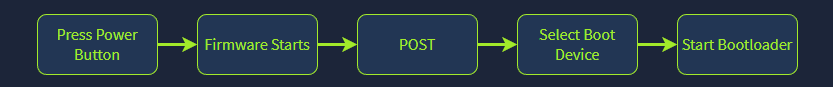 Ahora que los componentes principales están instalados en el sistema informático, es hora de arrancarlo. Podemos comparar esto con cuando nos despertamos por la mañana y hacemos una comprobación rápida para ver si todo funciona. Solo cuando todo está bien, nos levantamos y comenzamos el día. La imagen a continuación muestra los pasos que sigue un sistema informático antes de mostrar una interfaz funcional (en forma de sistema operativo).