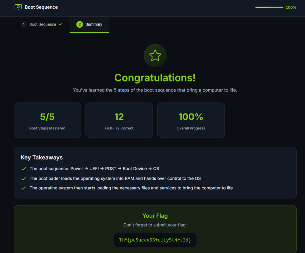 Hemos cubierto los componentes principales de un sistema informático y cómo se inicia. De momento, no te darás cuenta de esto, pero más adelante, al aprender conceptos de ciberseguridad, a menudo necesitarás recordar la función de cada uno de estos componentes principales y cómo interactúan entre sí. El proceso de arranque es un concepto muy importante más adelante, ya que a veces es blanco de ataques de hackers.