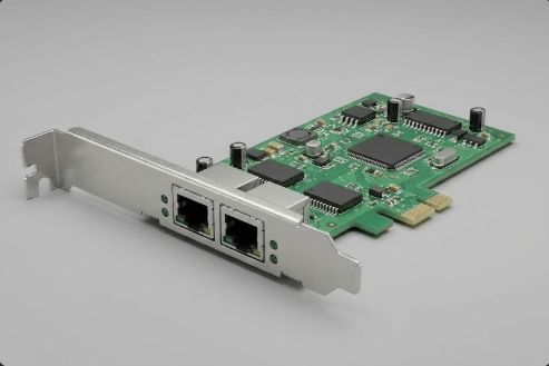 ¡Correcto! Los adaptadores de red permiten que tu computadora se comunique con otros sistemas. Al igual que usamos nuestras cuerdas vocales para comunicarnos con nuestro entorno, un adaptador de red permite que las computadoras se comuniquen con otros sistemas. Los adaptadores de red vienen en versiones inalámbricas y cableadas. Suelen estar integrados en la placa base, pero también pueden añadirse como tarjetas de expansión. Las tarjetas de red suelen conectarse mediante puertos PCI Express. La imagen a continuación muestra una tarjeta de red enchufable, que se usa habitualmente en equipos de escritorio.