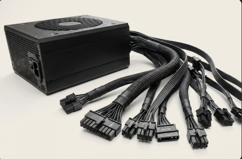 ¡Exactamente! La fuente de alimentación es como el corazón: bombea energía a todo. Todo sistema necesita energía. Al igual que nuestro corazón bombea sangre a nuestros órganos, una fuente de alimentación (PSU) suministra energía a todos los componentes del sistema. La PSU es esencial y requiere una cuidadosa consideración: si los componentes necesitan más energía de la que puede proporcionar, el sistema fallará. La PSU toma la energía de una toma de corriente y la distribuye a través de varios conectores, como el conector principal de la placa base y los conectores Molex. La imagen a continuación muestra una PSU utilizada en computadoras de escritorio.