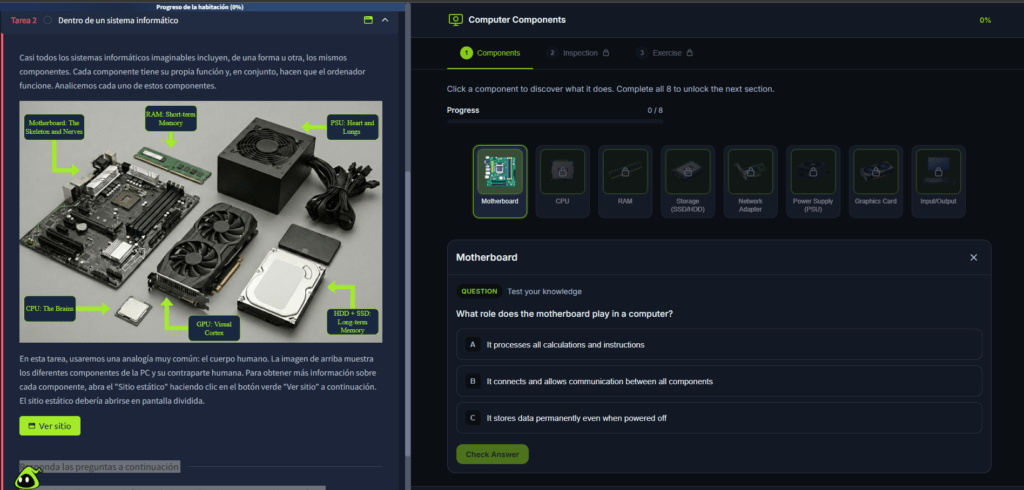Hola hacketones! En este capítulo de TryHackMe – Inside a Computer System imagina por un momento que eres el capitán de la guardia de un imponente castillo. Tu misión es protegerlo de cualquier intruso, pero hay un grave problema: jamás has recorrido sus pasillos, no sabes dónde está la sala del tesoro ni conoces la ubicación del almacén de alimentos. Intentar defender algo que no comprendes es, sencillamente, una batalla perdida antes de empezar. En el vasto mundo de la ciberseguridad, ocurre lo mismo. Antes de enfrentarnos a amenazas complejas, debemos conocer la distribución de nuestra «fortaleza» digital: la computadora. Entender cómo interactúan sus componentes no solo desmitifica la tecnología, sino que te brinda la base necesaria para proteger tu información. Permíteme guiarte en este recorrido por los órganos vitales de tu máquina.
