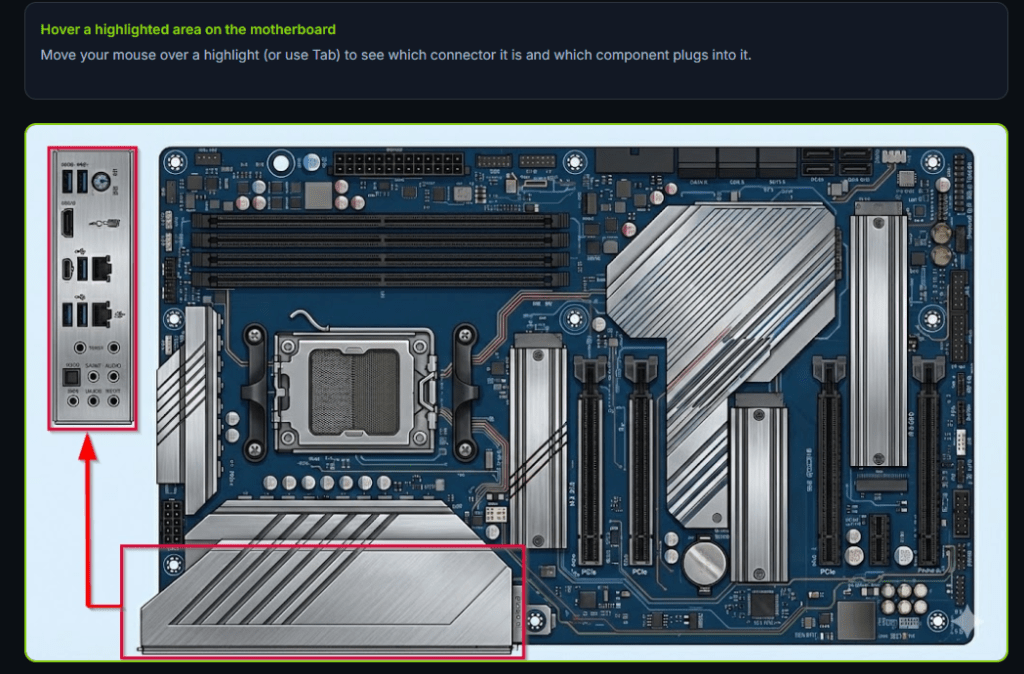 Pase el cursor sobre un área resaltada en la placa base Mueva el mouse sobre un área resaltada (o use la tecla Tab) para ver qué conector es y qué componente se conecta a él
