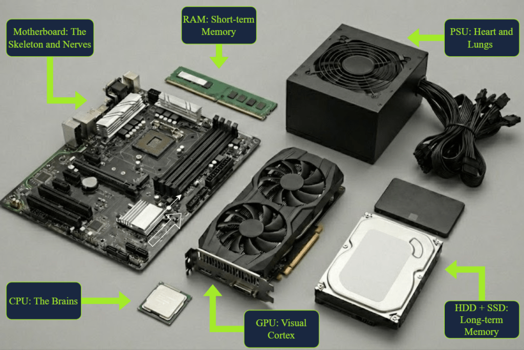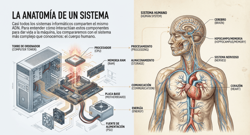 En esta tarea, usaremos una analogía muy común: el cuerpo humano. La imagen de arriba muestra los diferentes componentes de la PC y su contraparte humana.