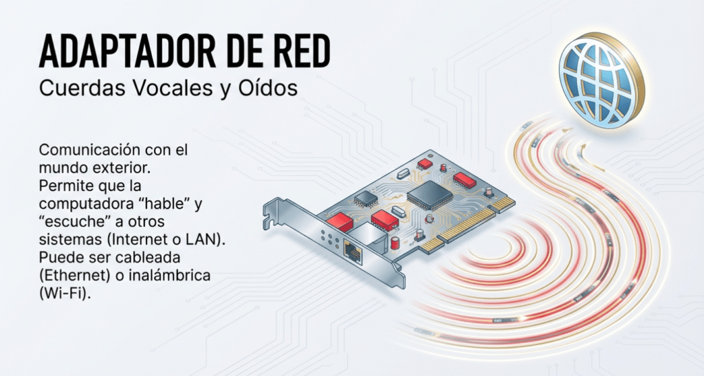 Adaptador de RedPermite la comunicación con otras computadoras y redes.Cuerdas vocales.PCI Express, conexiones inalámbricas/cableadas.Infraestructura física (Comunicación).