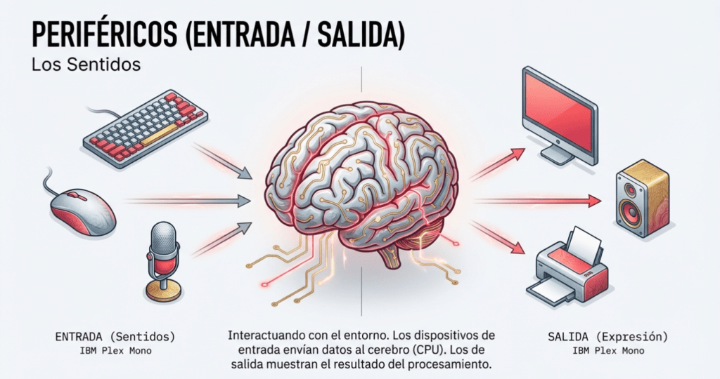 Al igual que tenemos sentidos para obtener información que nuestro cerebro procesa, las computadoras tienen dispositivos de entrada y salida. Los dispositivos de entrada incluyen teclados, micrófonos, ratones y escáneres. Los dispositivos de salida incluyen monitores, impresoras y altavoces. Los conectores comunes para estos periféricos incluyen USB, HDMI y DisplayPort. La imagen a continuación muestra algunos de los dispositivos de E/S básicos.