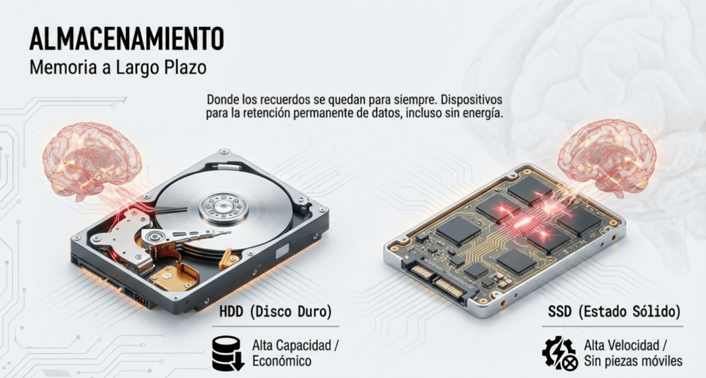 Almacenamiento (SSD/HDD)Guarda datos de forma permanente, incluso sin energía.Memoria a largo plazo.SATA, PCI Express, chips de memoria (SSD).Infraestructura física (Memoria no volátil).