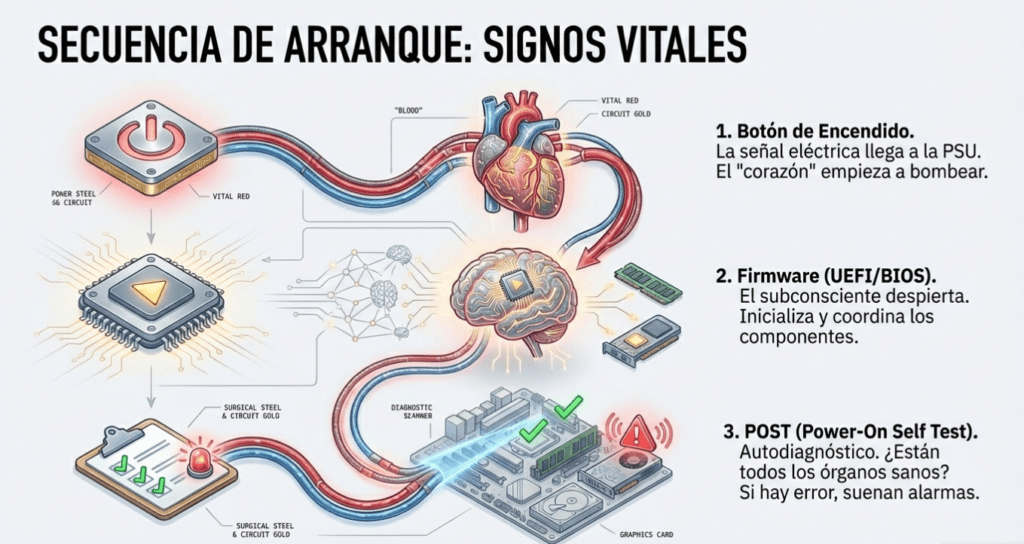 Paso 3: POST (Autoprueba de encendido)Comprueba que el hardware necesario esté presente y funcione correctamente.Comprobación rápida de salud al despertar.UEFI, señales de alarma/pitidos.Fase lógica: Verificación de hardware.