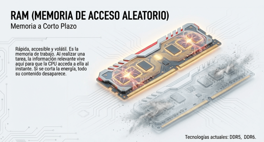 RAM (Memoria de acceso aleatorio)Almacena datos temporalmente para acceso rápido de la CPU.Memoria a corto plazo o de trabajo.DDR5, DDR6.Infraestructura física (Memoria volátil).