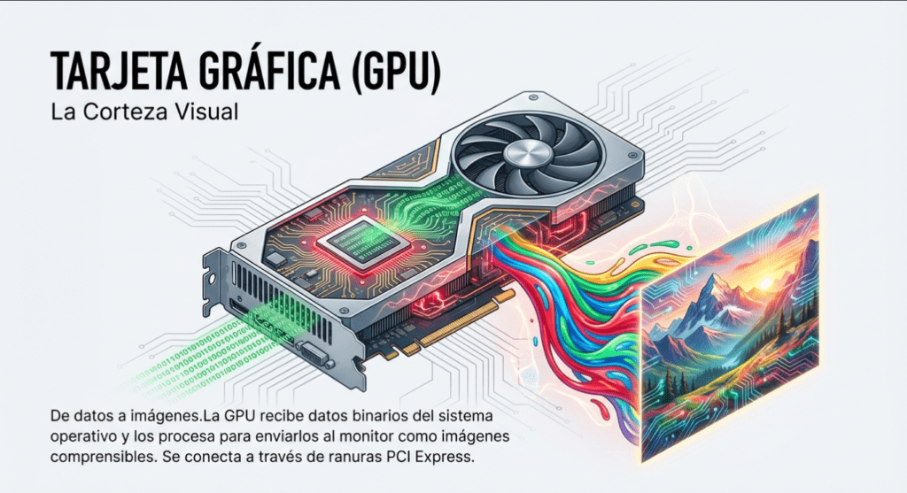 Tarjeta GráficaProcesa y envía información visual a las pantallas.Corteza visual del cerebro.PCI Express, Monitor.Infraestructura física (Procesamiento de imagen).