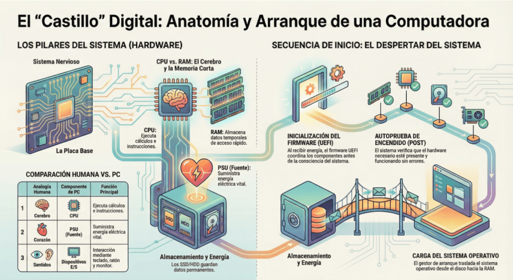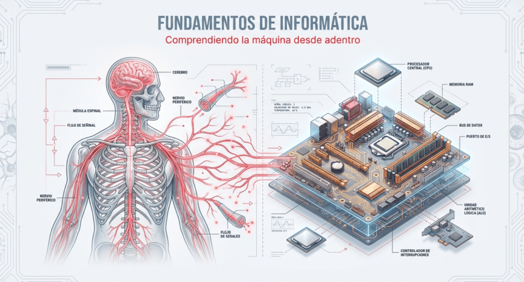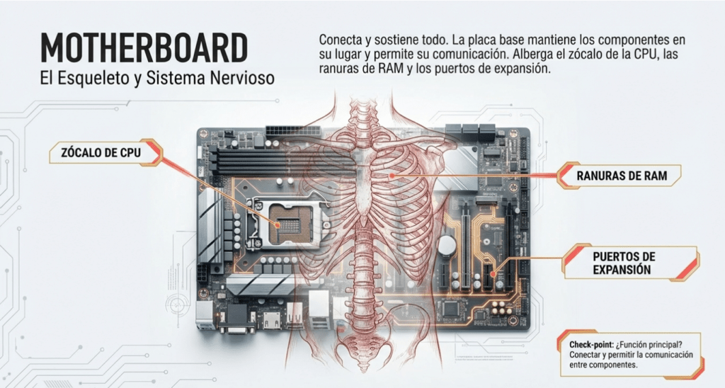 Placa base (Motherboard)Conecta y permite la comunicación entre todos los componentes del sistema.Esqueleto y sistema nervioso.Zócalo de CPU, ranuras de RAM, ranuras de expansión, puertos.Infraestructura física (Hardware principal).