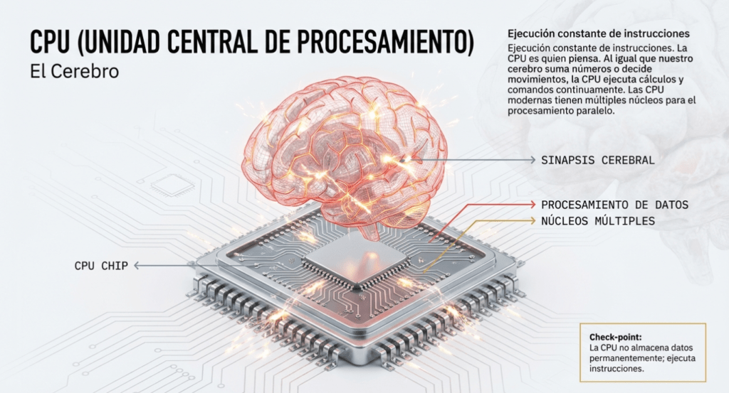 CPU (Unidad Central de Procesamiento)Ejecuta instrucciones y realiza cálculos constantemente.Cerebro (ejecución de instrucciones).Zócalo de CPU, múltiples núcleos.Infraestructura física (Procesamiento).