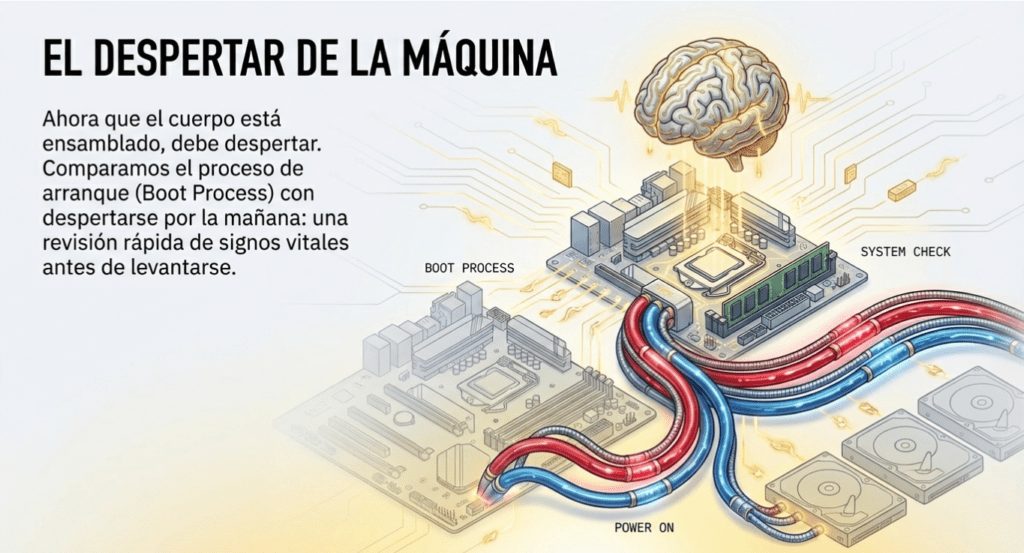 Al presionar el botón de encendido de nuestro sistema informático, se envía una señal a la fuente de alimentación para permitir el flujo de energía. Imagine que nuestro cuerpo se apaga mientras dormimos. Al despertar y recibir oxígeno, nuestro cuerpo comienza a bombear sangre y se activa.