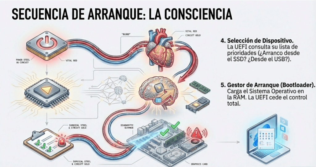 Paso 5: Carga del Gestor de ArranqueCarga el sistema operativo en la RAM y cede el control.Rutina para iniciar la consciencia.RAM, Gestor de arranque.Fase lógica: Transferencia al SO.