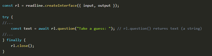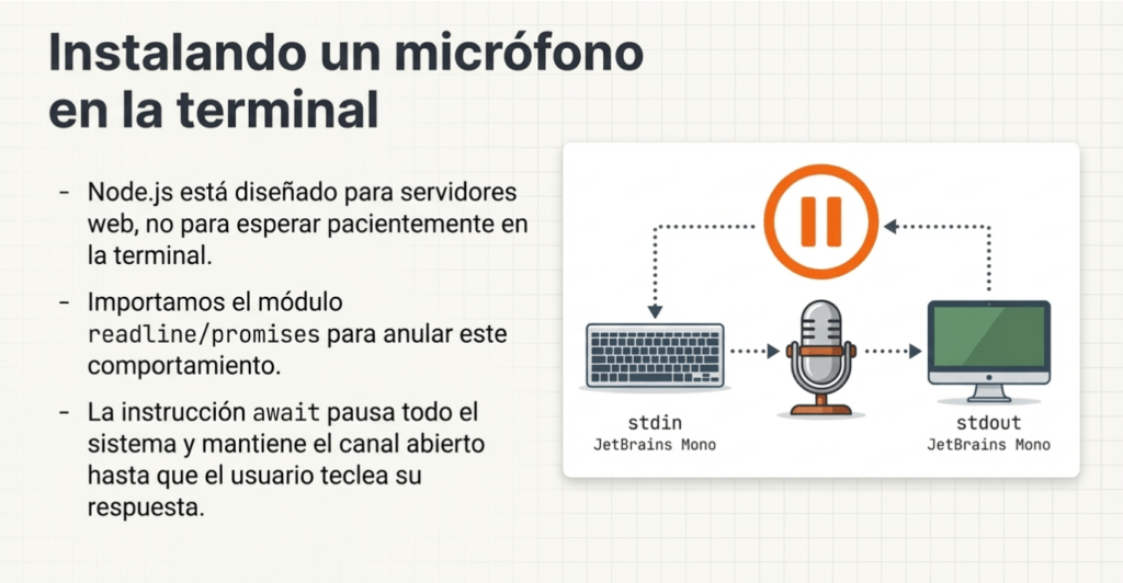 - Estamos importando el readline módulo con la /promises parte, indicando que el script manejará la espera sin congelar todo