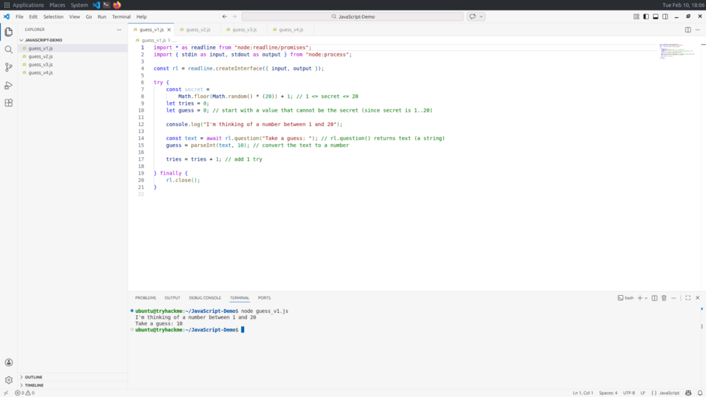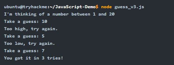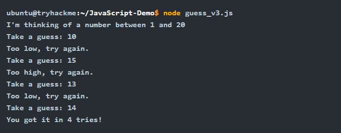 Puedes probarlo en el sistema ejecutando [Nombre del programa]. node guess_v3.jsSe encuentra en [Nombre /home/ubuntu/JavaScript-Demo del programa]. Cada vez que vuelvas a ejecutar el programa, debería elegir un nuevo número secreto para que lo adivines.
