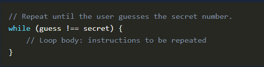 Una forma de lograr esto es pedirle al usuario que realice nuevas suposiciones mientras su suposición sea incorrecta, es decir, while si «there» no guess es igual a secret. Esto es bastante fácil de expresar en JavaScript: while (guess !== secret). The !==significa «no es igual». Esto se llama while y se escribe como se muestra a continuación: