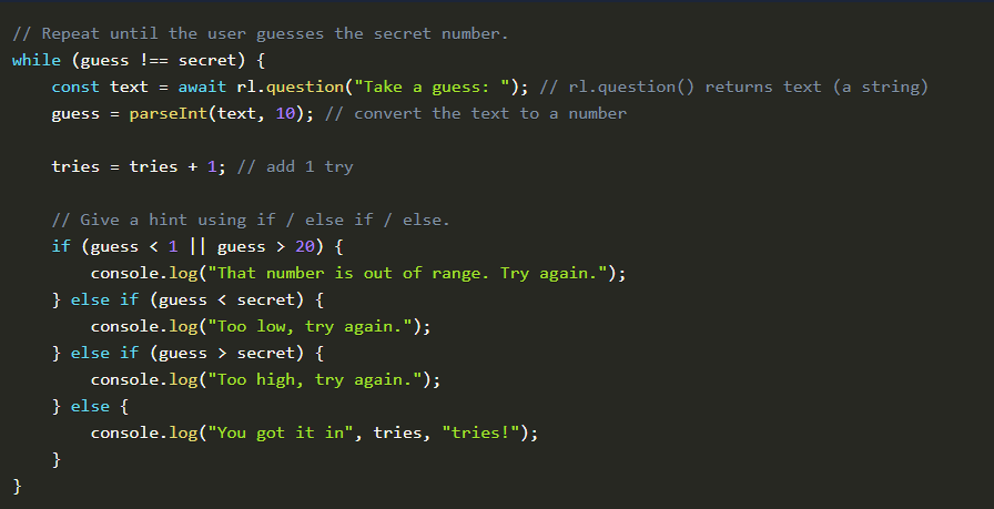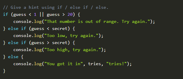 - else if (guess < secret)Esto else significa que si la condición anterior no es verdadera, se ejecuta esta instrucción. if (guess < secret)Se evaluará si la suposición es menor que el secreto. De ser así, se console.log()mostrará «demasiado bajo» en la pantalla.