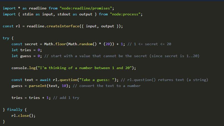 Indica let que estamos declarando variables. Al iniciar, el usuario no ha realizado ningún intento, por lo que tries se establece en 0; además, inicializamos guess con un valor que no puede ser accidentalmente el secret número que el usuario intenta adivinar. (Como nota al margen, secretes constante y se tratará en la siguiente subsección). Recuerda que el número secreto está entre 1 y 20.