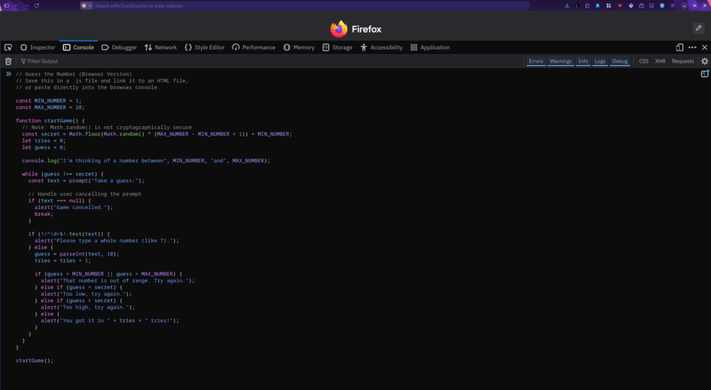 - if (guess < 1 || guess > 20)Si la suposición es menor que 1 o mayor que 20, se usa console.log()para indicar al usuario que el número está fuera de rango. Tenga en cuenta que ||representa «o» en JavaScript.