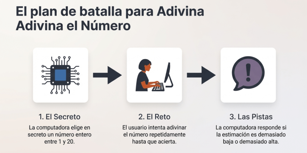 En esta sala, crearemos un juego de «Adivina el Número». Nuestro plan será el siguiente: